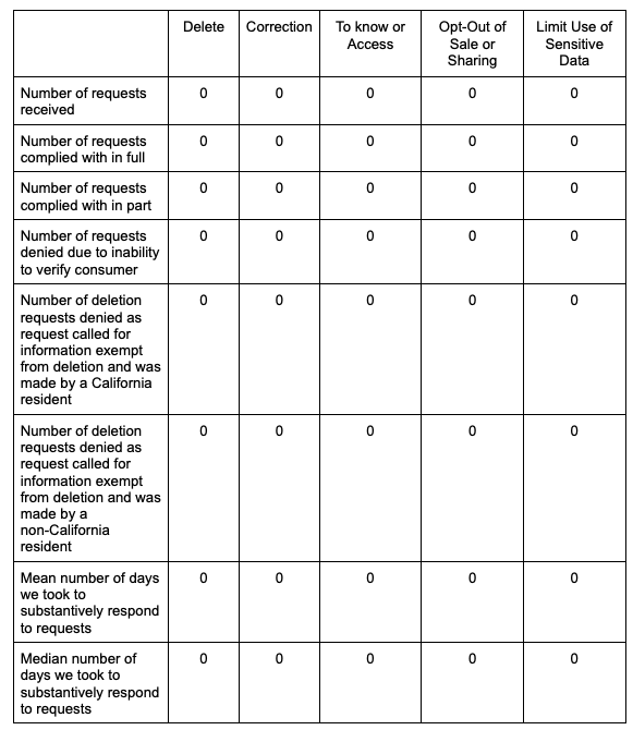 California law requires certain businesses to compile and disclose metrics on an annual basis regarding their compliance with the CCPA and consumer rights requests. Reklaim reports the following metrics for the period of January 1, 2023, through December 31, 2023.