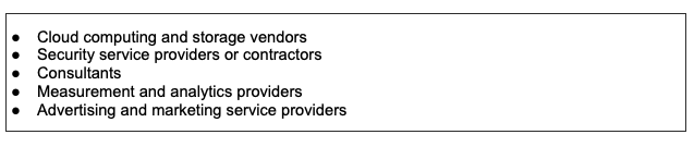 As noted above, we may disclose any personal information with our service providers, which may include (for instance) providers involved in tech or customer support, operations, web or data hosting, billing, accounting, security, marketing, data management, validation, enhancement, or hygiene, or otherwise assisting us in providing, developing, maintaining, and improve our services.
